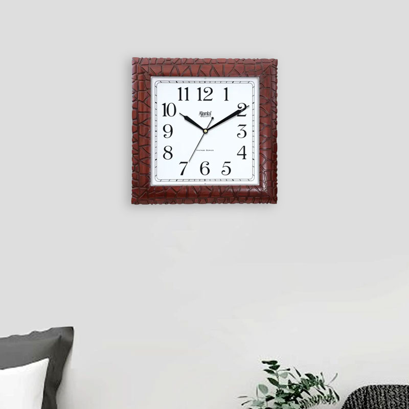 Ajanta 7047 Square Vintage Wall Clock (Mahogany) A sophisticated square wall clock featuring a textured mahogany-finish frame. The classic design is complemented by a clear white dial and reliable quartz movement, making it an ideal choice for adding vintage charm to any room.