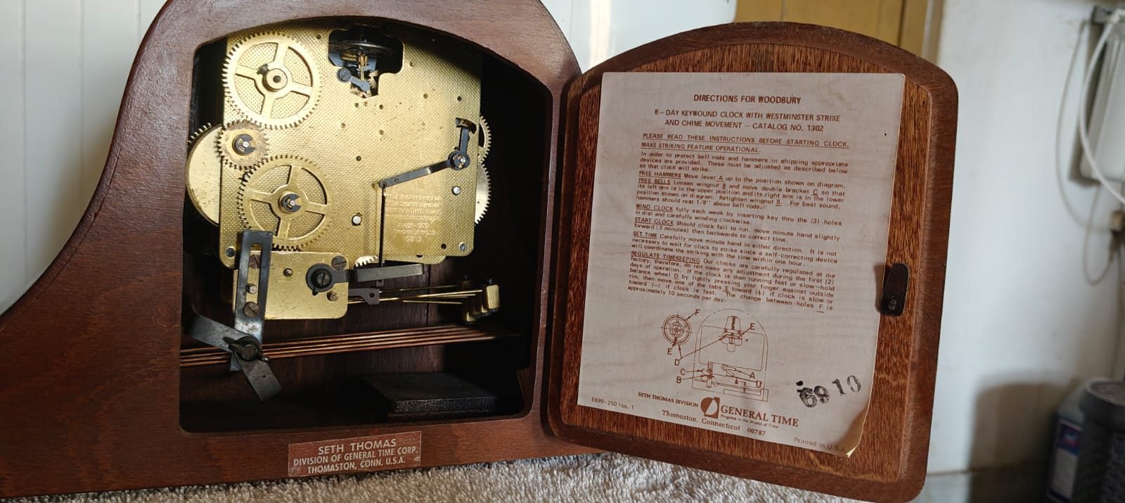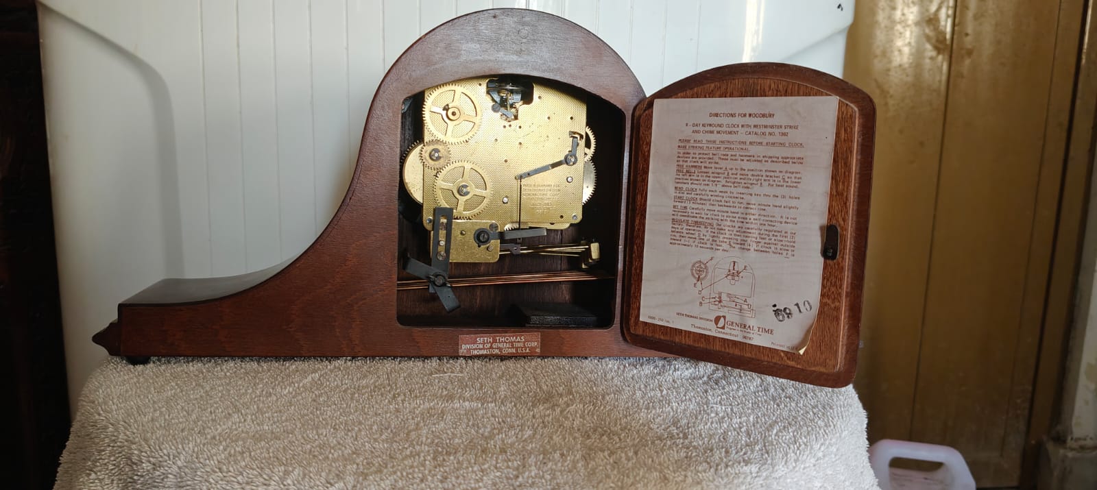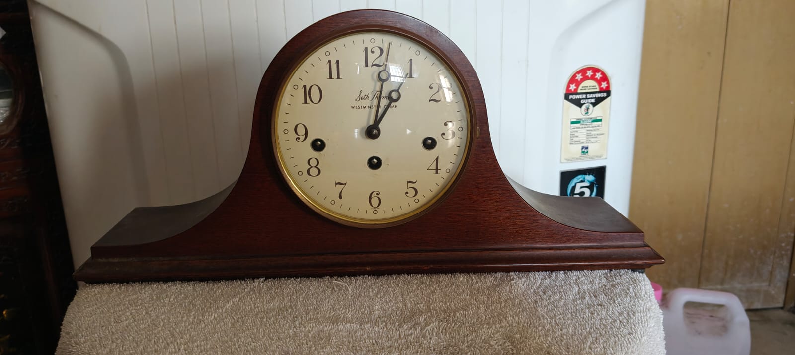 Antique Seth Thomas Mantle Clock (1950s Vintage) Own a piece of history with the Seth Thomas AST-001. This collectible 1950s mantle clock features a stunning wooden frame, a white glass dial, and a classic four-chime mechanism. Perfect for vintage enthusiasts, it combines traditional craftsmanship with functional elegance to elevate any mantle or desk.