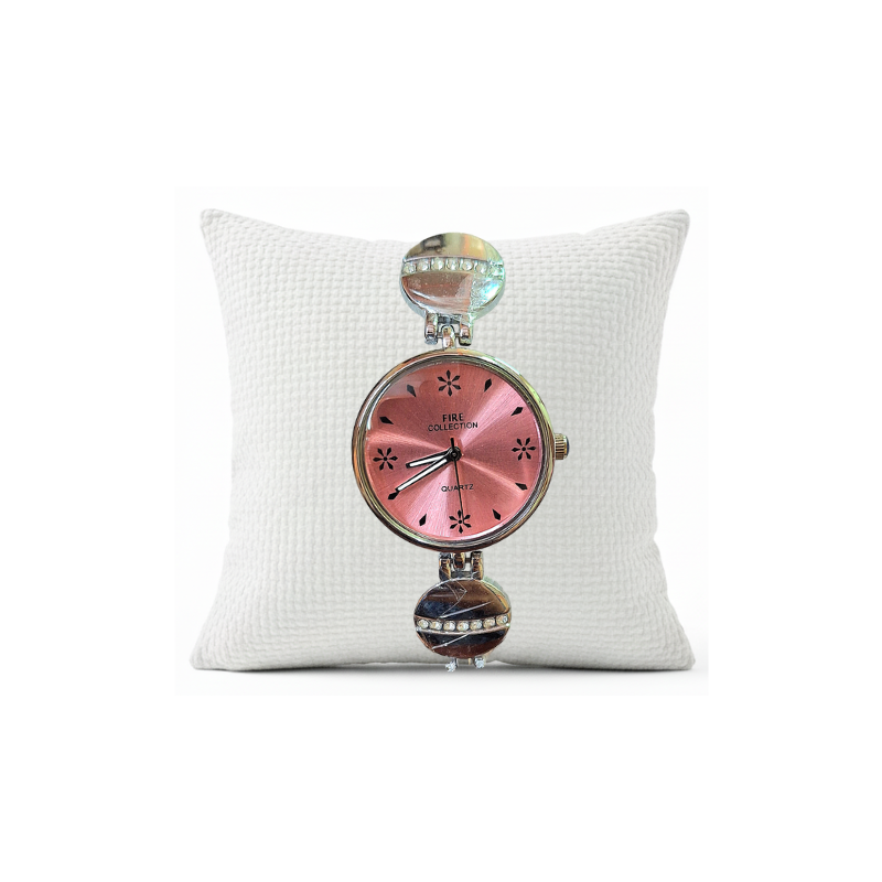 The Fire Quartz Watch is a beautiful expression of delicate elegance. The watch features a soft pink dial adorned with unique floral-shaped hour markers, giving it a whimsical and feminine touch.