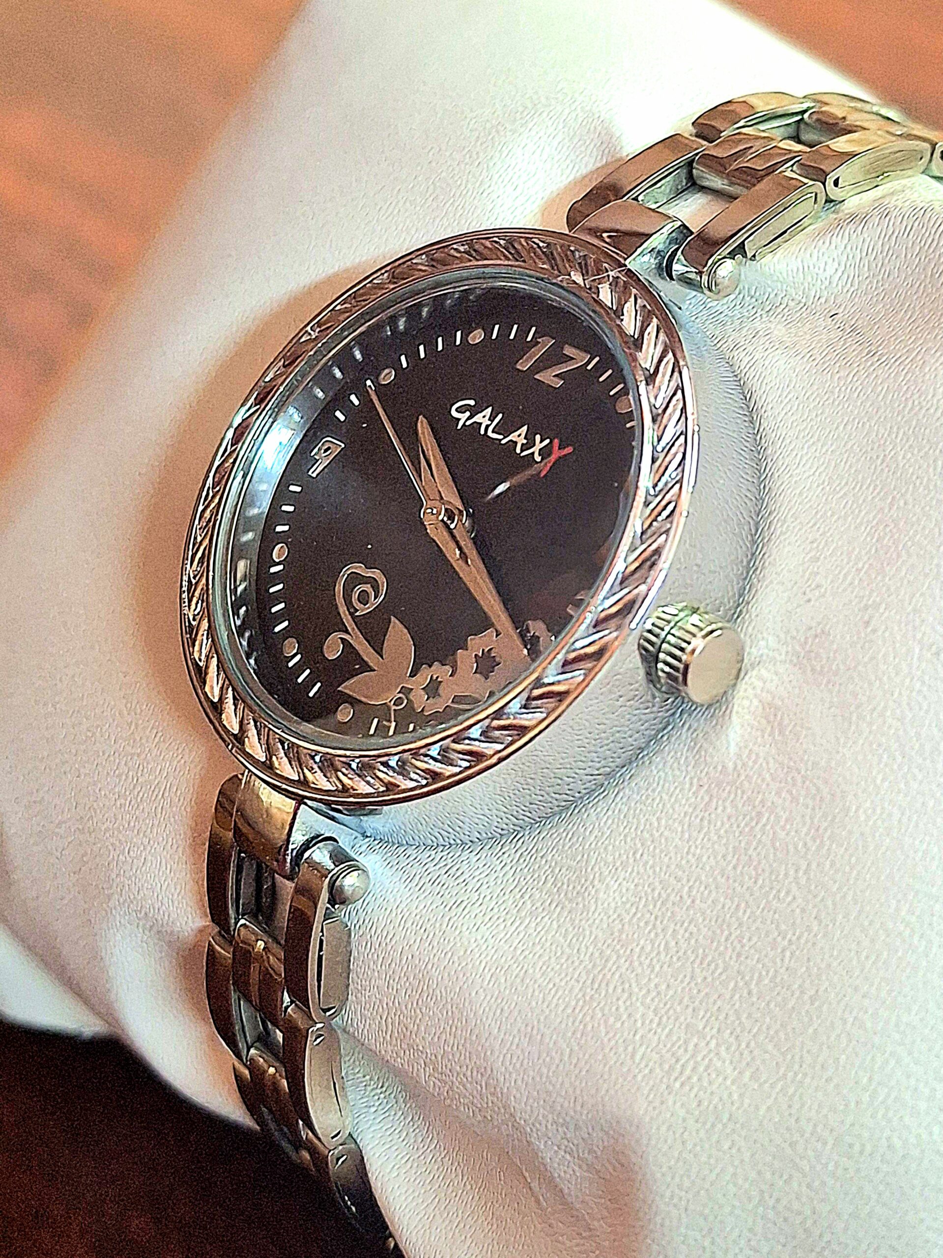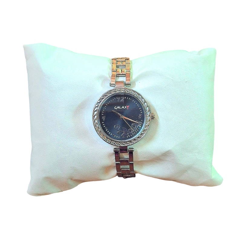 Make a bold statement with this beautiful Galaxy ladies’ timepiece, featuring a sophisticated, deep black dial for a dramatic contrast. The dial is subtly adorned with a delicate floral or winding vine pattern and simple, contrasting hour markers. The watch case is framed by an eye-catching intricately textured bezel, adding a unique dimension. It is held by a polished two-tone metal bracelet that combines silver and rose gold-tone links for a modern, versatile finish. Powered by reliable quartz movement, this watch transitions effortlessly from day to night, offering a touch of refined elegance for any occasion.