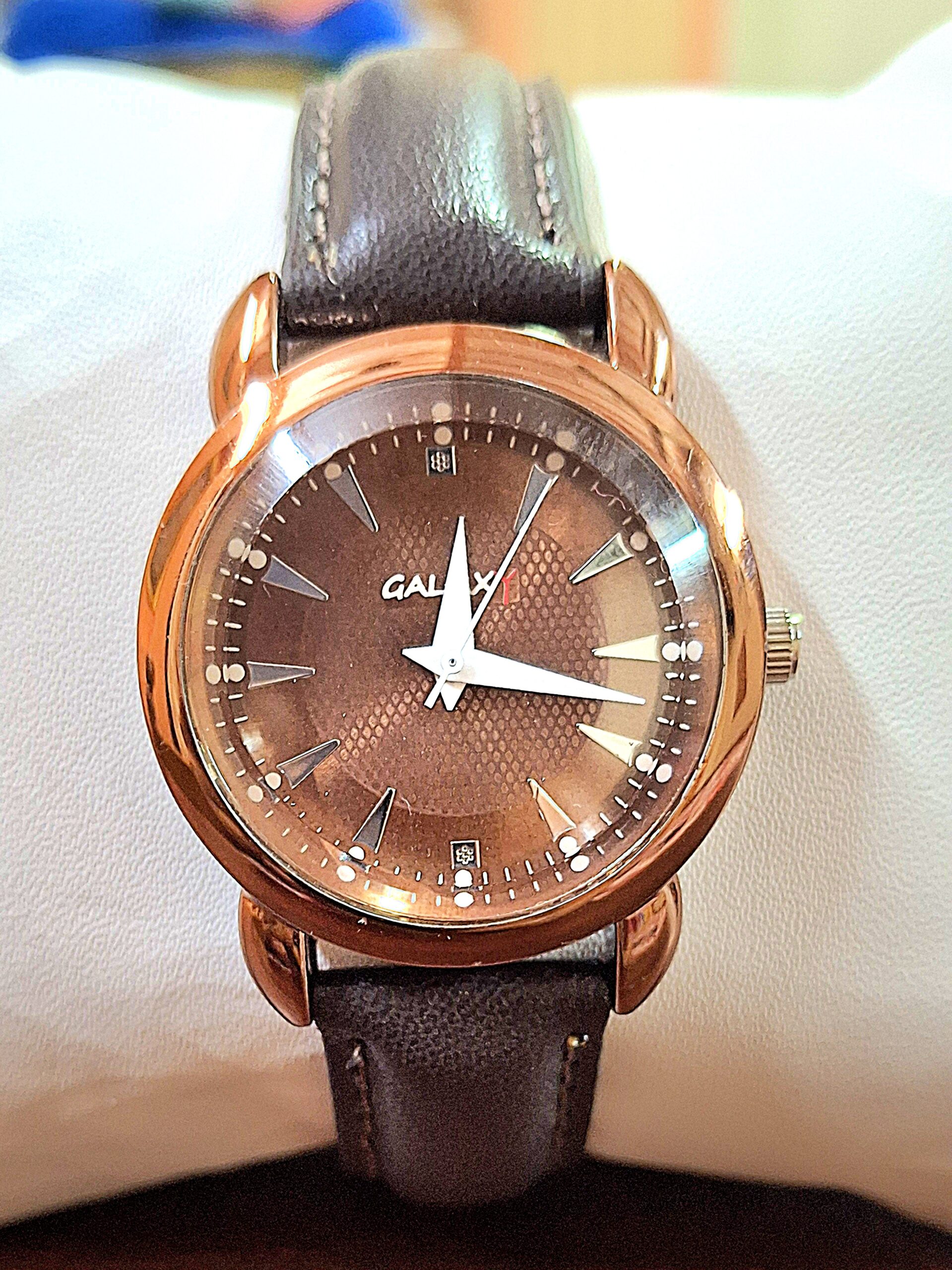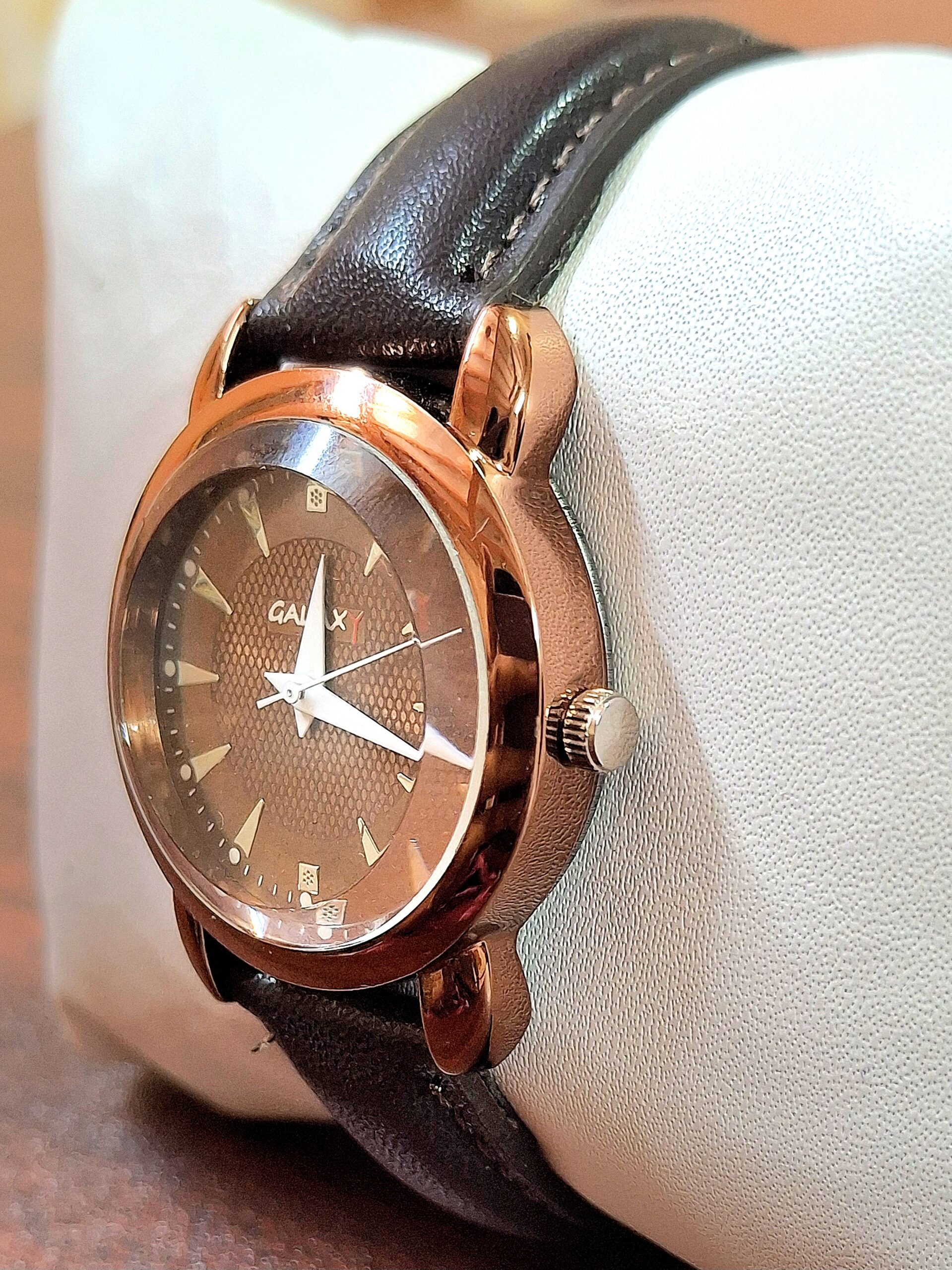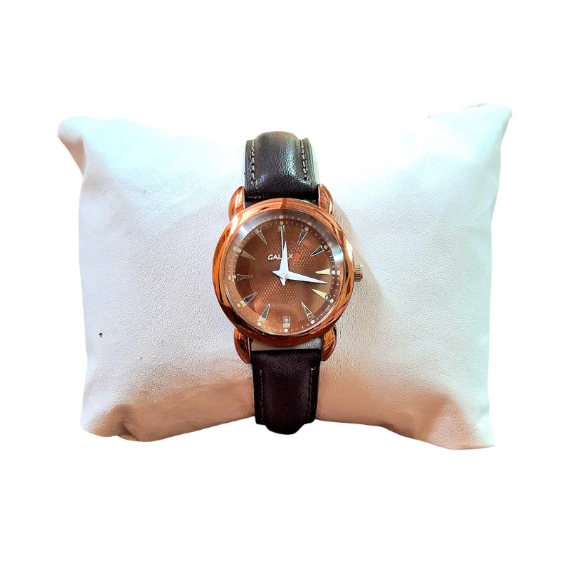 Embrace subtle luxury with the refined design of this Galaxy ladies’ watch. It showcases a high-polish brown case with gracefully rounded lugs. The centerpiece is the sophisticated brown sunray dial, which provides a beautiful, deep tone complemented by simple stick hour markers and a tiny rhinestone accent at o’clock. The warm metal tones are balanced by a classic, durable dark brown faux leather strap. This elegant combination creates a timeless accessory perfect for daily wear or adding a touch of warmth to your evening ensemble.