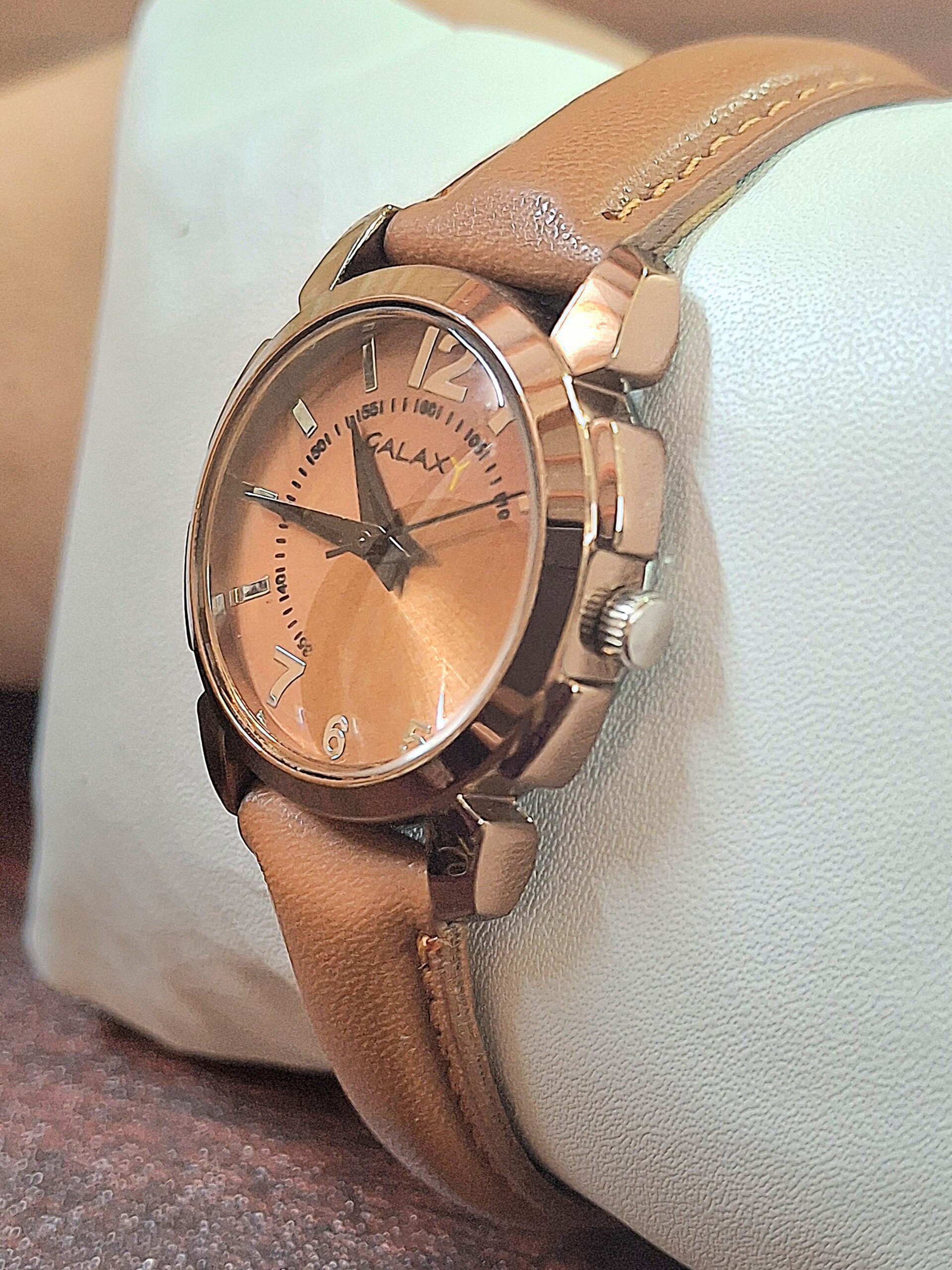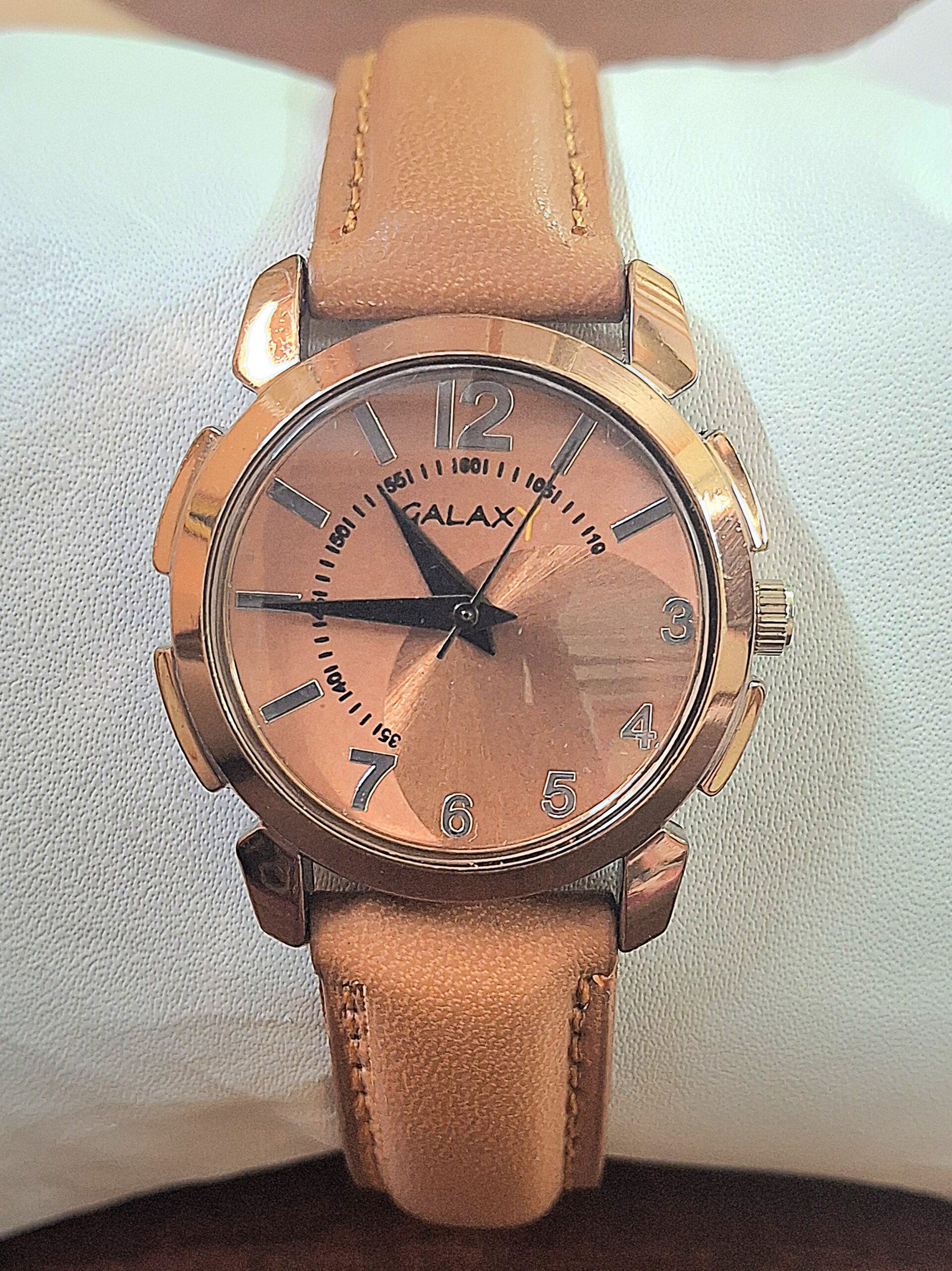 Capture a warm, sophisticated look with this eye-catching Galaxy timepiece. It features a substantial brown case with prominent lugs and a matching sunray dial. The dial is accented with clear numeral markers and a functional minute track around the edge. A prominent bezel featuring minute indicators gives it a sporty, chronograph-inspired appearance. This watch is perfectly completed by a comfortable, stitched brown faux leather strap. Powered by quartz movement, this watch is an on-trend accessory that effortlessly blends casual utility with elegant, contemporary color.