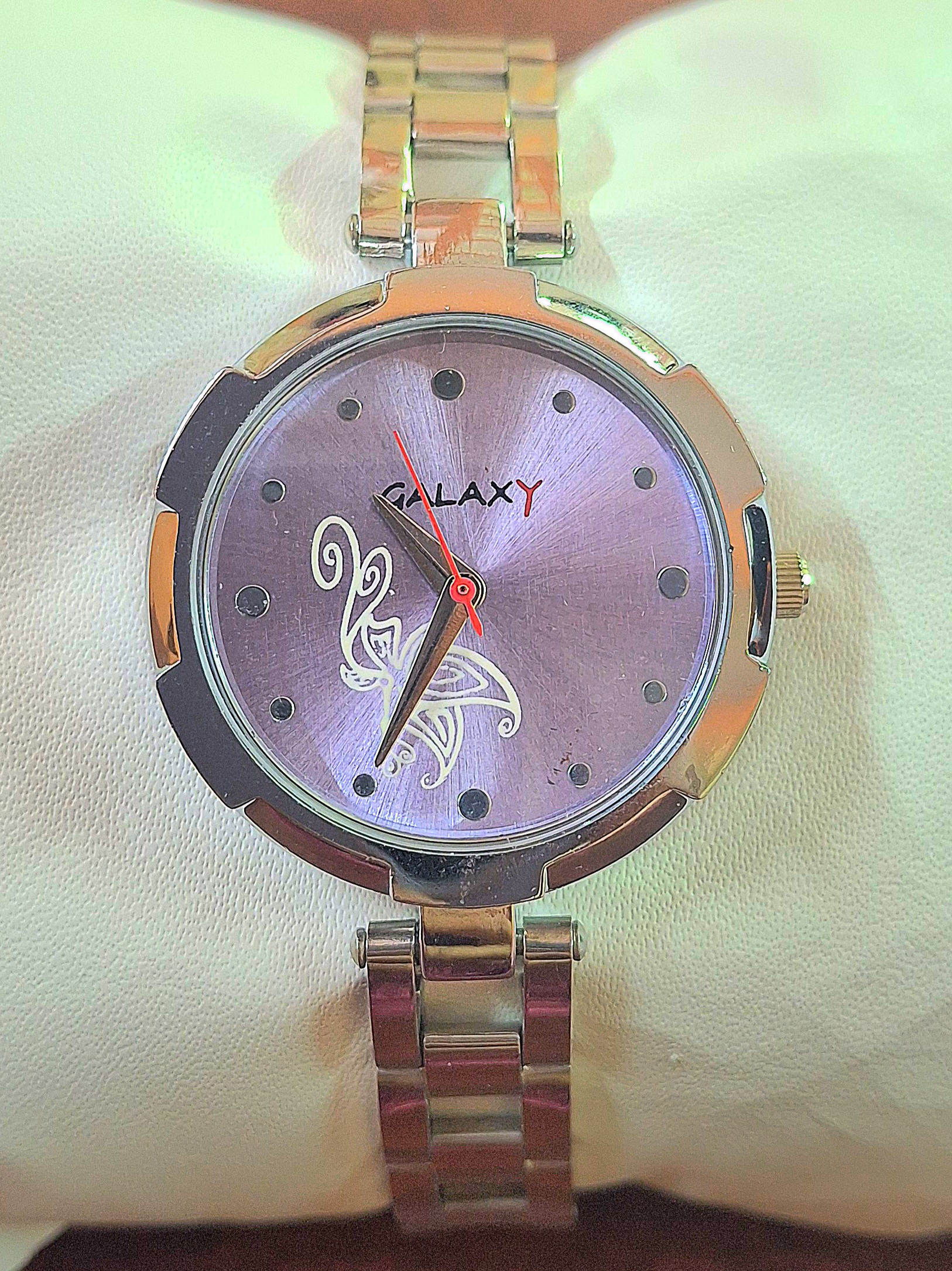 Add a touch of musical elegance to your wrist with this sophisticated Galaxy ladies’ watch. It features a smooth, polished rose gold-tone metal alloy bracelet and a matching round case for a warm, luxurious feel. The exquisite pink iridescent dial is captivating, set with unique oval, shell-like markers instead of traditional numbers. The design is highlighted by a delicate swirl or treble clef-like motif in the center, giving it an artistic personality. Powered by accurate quartz movement, this watch is the perfect accessory to elevate your daily style or complement a graceful evening outfit.