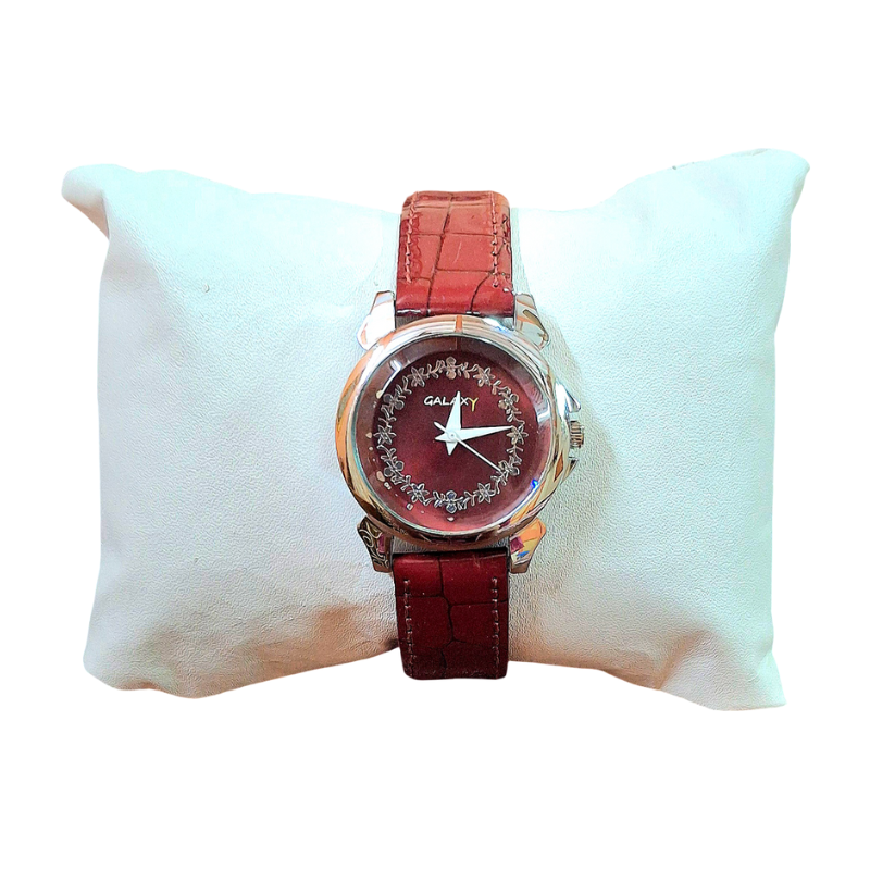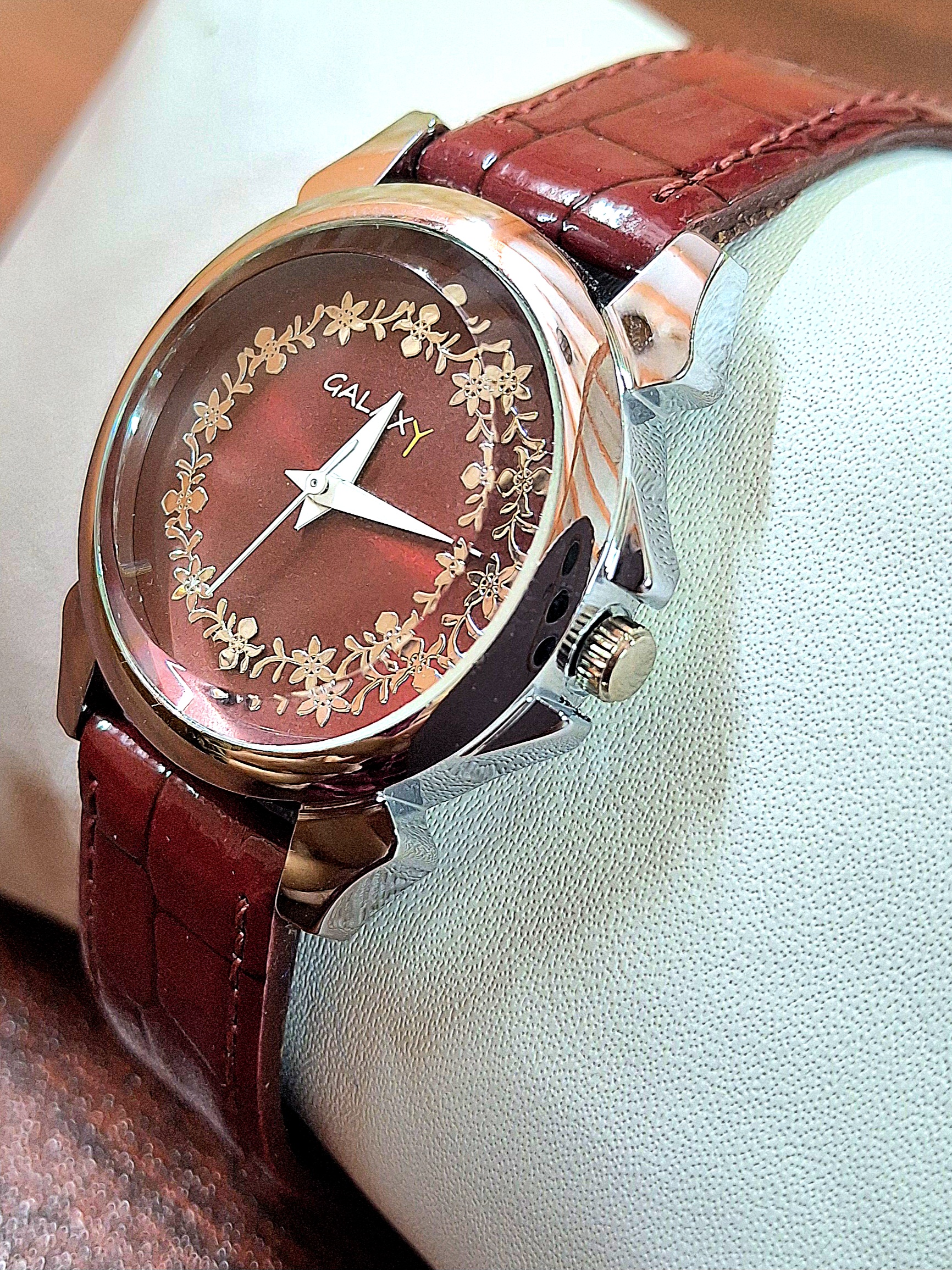 Make a sophisticated statement with the rich texture and color of this Galaxy watch. It features a unique red dial complemented by a beautiful silver floral wreath replacing the hour markers. This timepiece is anchored by a high-fashion, croc-embossed faux leather strap in a deep reddish-brown/maroon tone, giving the whole piece a luxurious, tactile feel. The polished silver-tone case allows the bold colors and textures to stand out. Powered by quartz movement, this watch is an exquisite choice for adding depth and texture to your outfit, making it ideal for evening wear or professional attire.