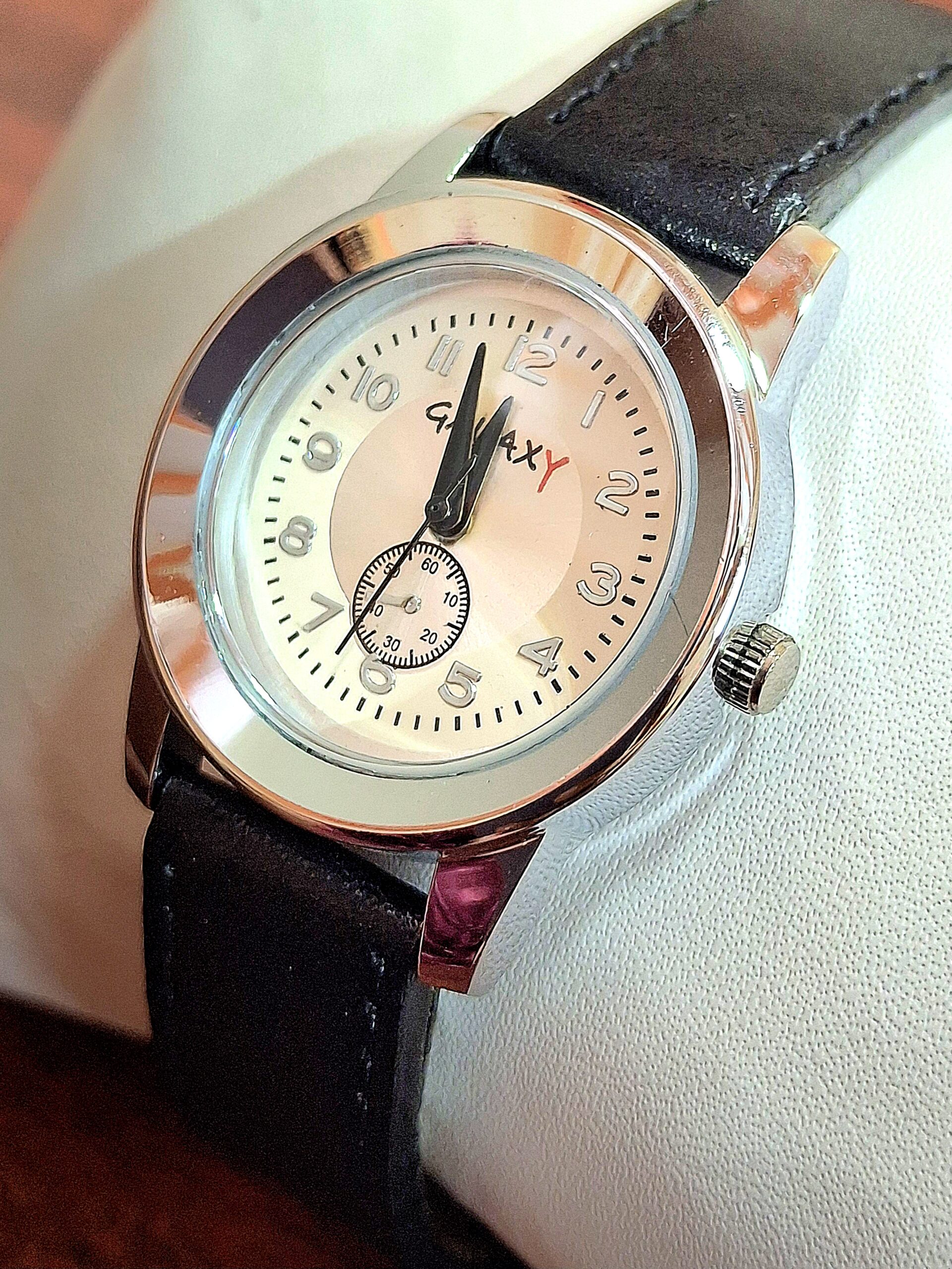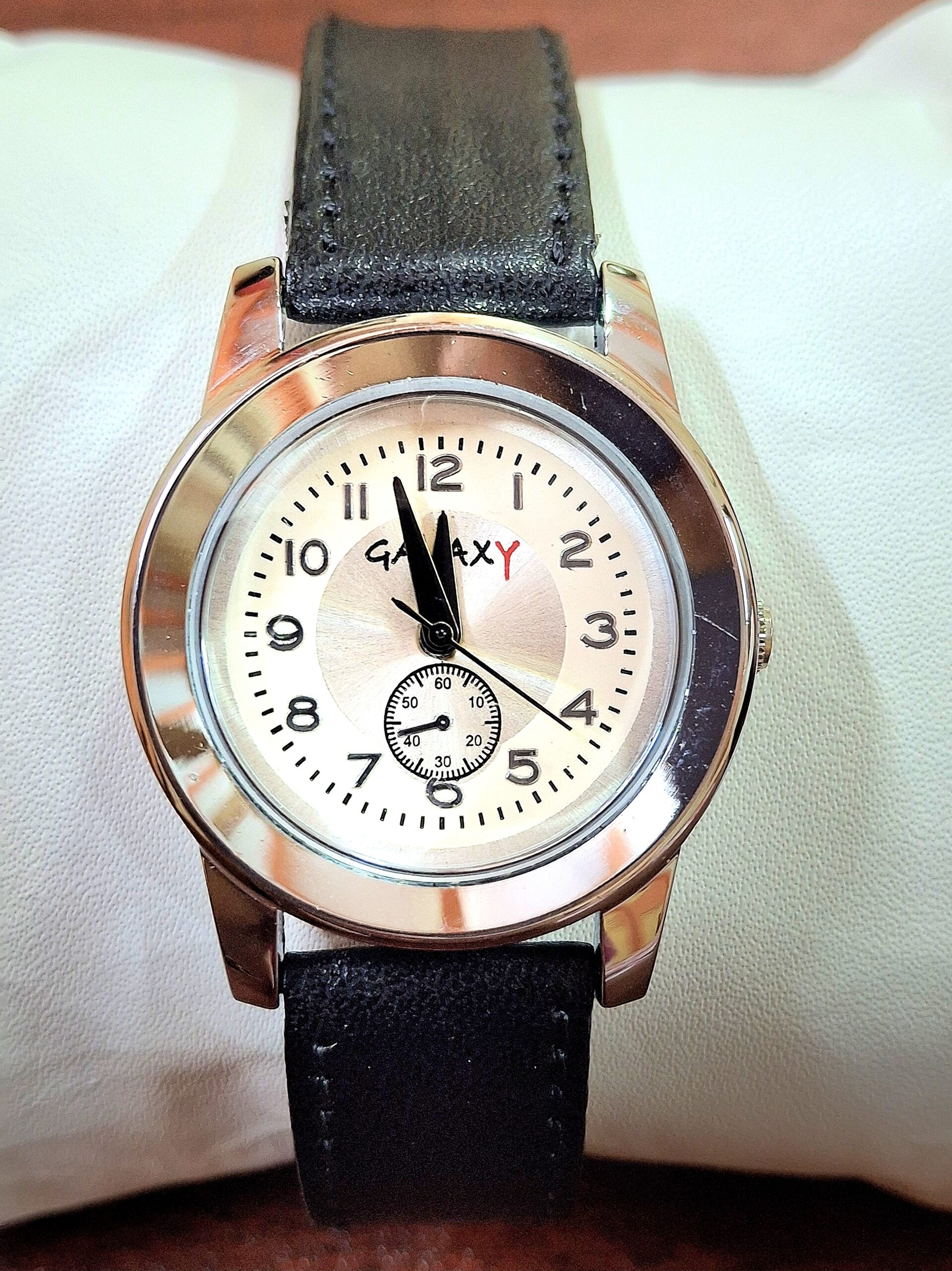 For a watch that blends classic style with high readability, look no further than this Galaxy timepiece. It features a standard, polished silver-tone case and a clean white dial marked with distinct numerals for all-day legibility. A functional or decorative sub-dial is positioned above the o’clock mark, adding a sophisticated touch. The watch is completed with a durable, comfortable black faux leather strap that offers excellent contrast and versatility for various occasions. This quartz-powered watch is a practical and dependable choice for daily wear, whether you’re heading to the office or running errands.