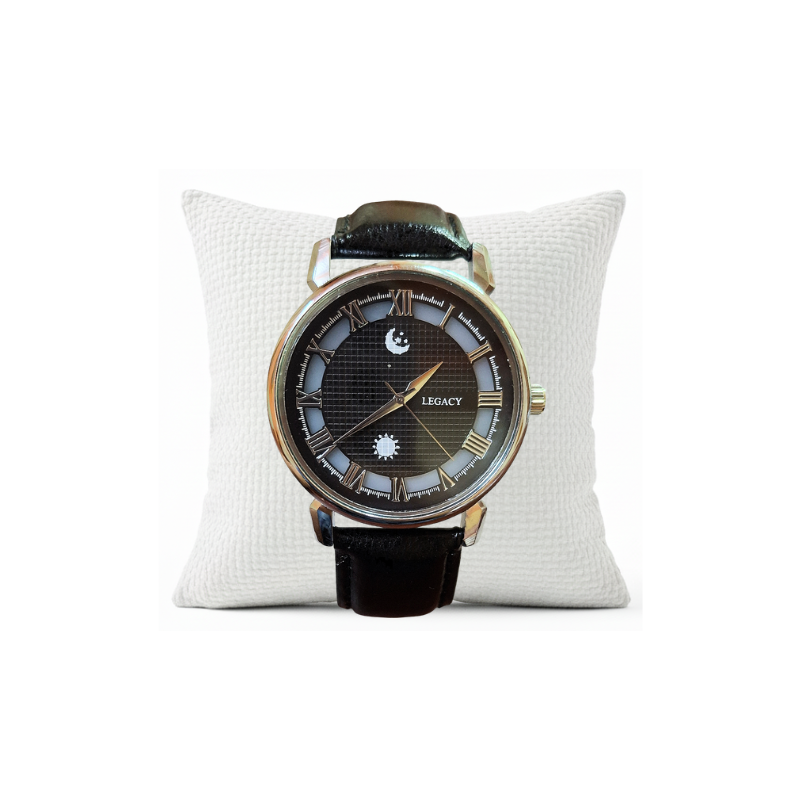 Embrace traditional elegance with this refined LEGACY timepiece. It features a comfortable black faux leather strap and a sophisticated black dial accented with classic white Roman numerals. The centerpiece is the detailed Sun and Moon phase indicator at the top and bottom of the dial, lending the watch a high-end, classic complication look. This quartz watch is perfect for those who appreciate a blend of modern size and timeless watchmaking aesthetics.