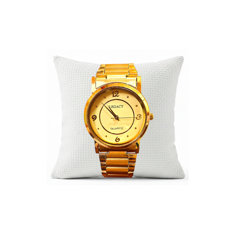 The Legacy Quartz Watch offers an essential, sophisticated accessory for any wardrobe. Finished in a highly polished bright gold tone across the case and the metal link bracelet, this timepiece delivers a look of traditional elegance and prominence.