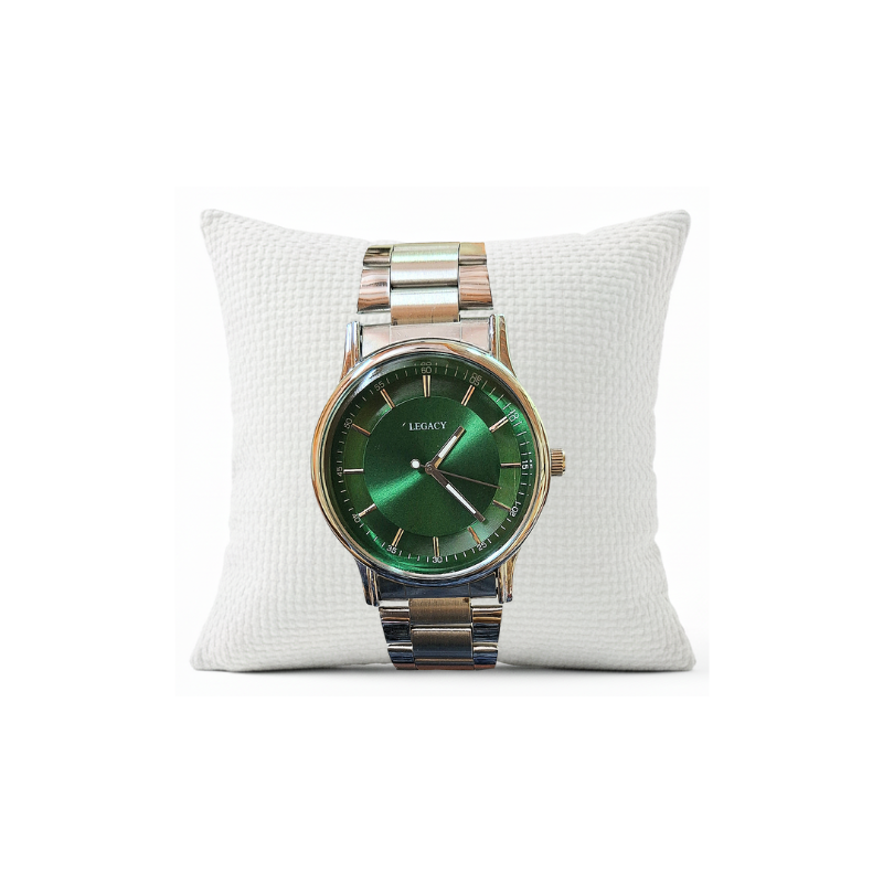 Make a confident, stylish statement with this refined Legacy men’s watch. It features a substantial silver-tone link bracelet and a polished case for a clean, classic feel. The focal point is the deep, vibrant green sunray dial, which provides a striking contrast and catches the light beautifully. The dial is kept minimalist with sleek stick markers and a precise minute track for a modern, uncluttered look. With its bold color choice and durable design, this quartz watch is an excellent accessory for the sophisticated man who values contemporary style.