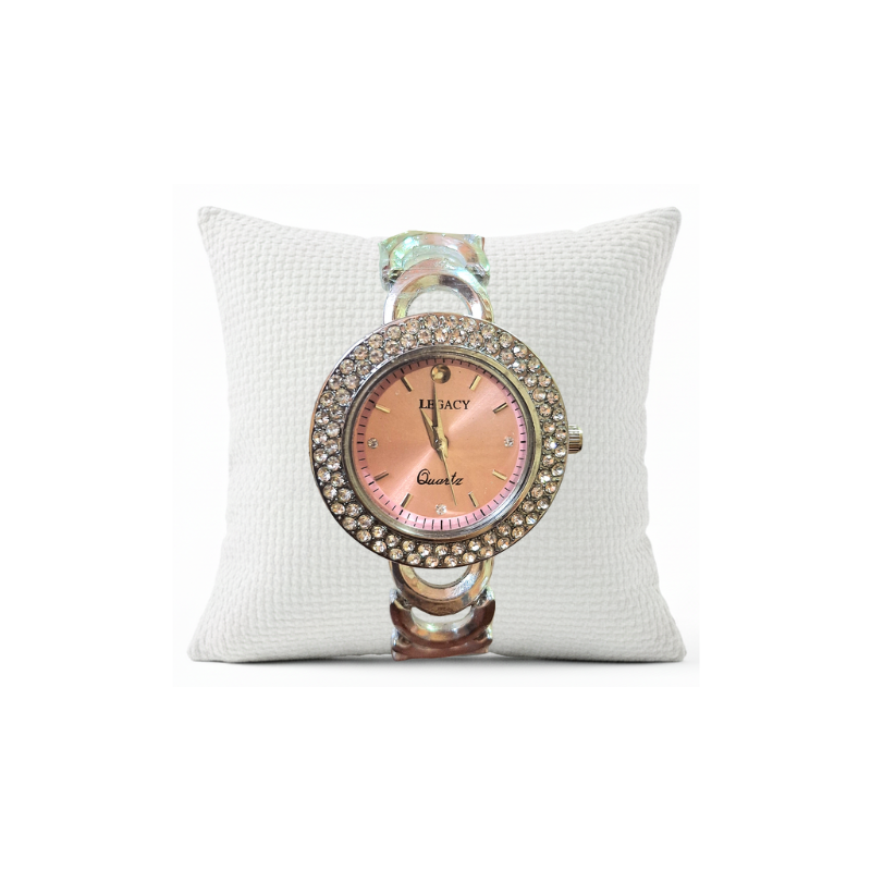 The Legacy Quartz Watch is a truly dazzling statement piece designed to turn heads. The soft pink sunray dial provides a gorgeous, deep contrast to the surrounding crystal-set bezel, which catches the light with every movement.