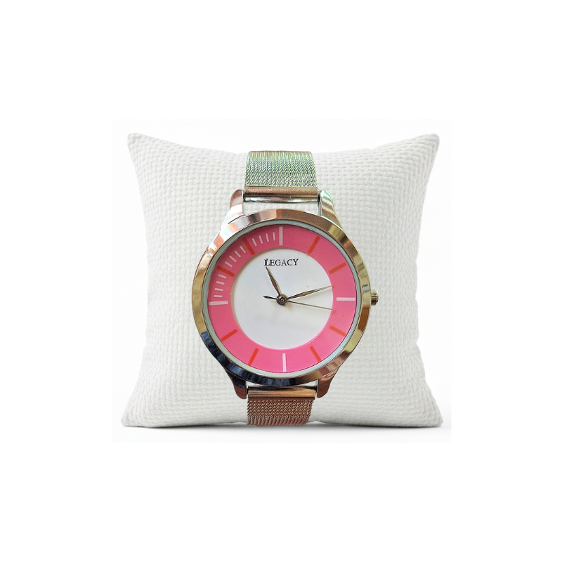 The dial is the standout feature, using a color-blocking technique with a bright pink outer ring and a clean white center, offering a chic, graphic look. Minimalist stick hands and markers keep the design clean and focused on the vibrant color. Powered by reliable quartz movement, this watch is the perfect modern accessory to elevate your casual or semi-formal wardrobe. The adjustable mesh strap ensures a smooth, custom fit on any wrist.