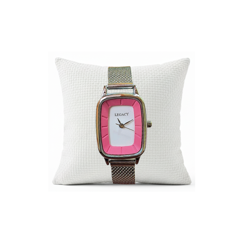 The Retro Pink Mesh Watch offers a stylish departure from traditional round watches. This piece features a contemporary rectangular case with soft, rounded corners and a vibrant pink and white color-block dial that provides a graphic, fashion-forward look.