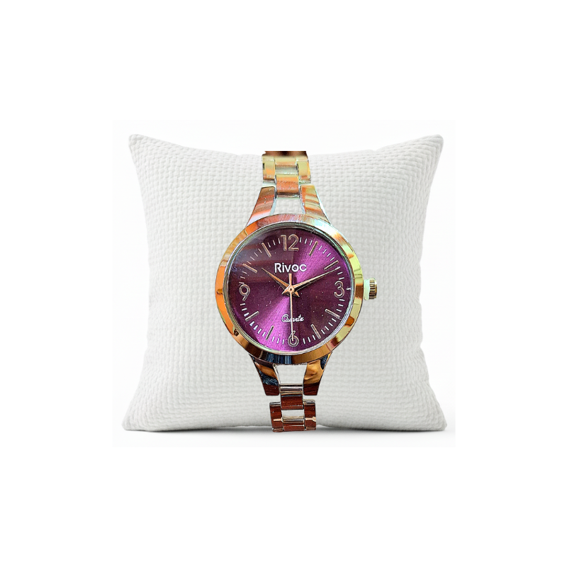 The Royal Plum Quartz Watch is designed for those who love to add a powerful splash of color to their look. This watch takes a classic silhouette and infuses it with bold, contemporary style via the rich, stunning plum-purple sunray dial. The dial catches the light beautifully, contrasting perfectly with the warm glow of the polished silver case and link bracelet.